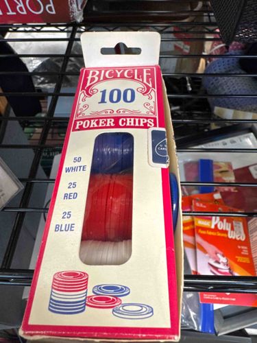This is a vintage or retro-style set of 100 poker chips manufactured under the Bicycle brand, a well-known name in playing cards and gaming accessories produced by the United States Playing Card Company. The chips are contained within their original cardboard retail packaging, which features a vertical rectangular layout with a clear plastic window for viewing the contents. The chips are made of molded plastic and come in three standard colors: 50 white, 25 red, and 25 blue. The packaging uses the iconic Bicycle typeface and red filigree designs typical of the mid-to-late 20th century. The box shows visible signs of age and wear, including significant fraying and creasing along the edges, particularly at the top and bottom corners. There is a blue 'US Playing Card' seal visible on the right side of the box, which appears partially detached or damaged. The cardboard has yellowed slightly, suggesting a period of long-term storage. The bottom of the box exhibits crushing, and the internal plastic tray holding the chips appears intact but may show some dust or environmental patina. This item is characteristic of mass-market gaming equipment from the late 20th century (likely 1980s-1990s) and reflects a functional, entry-level level of craftsmanship compared to professional clay casino chips.