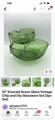 Vintage Emerald Green Glass Chip and Dip Set with Chrome-Plated Wire Rack