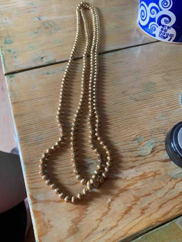 This item is a long, continuous strand necklace featuring uniform round beads. The beads possess a vibrant gold-tone finish and appear to be constructed from either plated metal or high-quality plastic, characteristic of mid-to-late 20th-century costume jewelry. Each bead carries a distinct textured or diamond-cut surface pattern that enhances light reflection, providing a shimmering effect. The necklace is designed as an opera or rope length, allowing it to be looped multiple times or worn as a single long strand. The craftsmanship displays consistency in bead shape and size, suggesting a mass-produced but well-finished accessory. Notable features include the absence of a visible clasp, indicating it is an 'over-the-head' style. The condition appears fair to good with some visible dulling and potential plating wear consistent with age and use. There are no immediate signs of broken links or missing beads, though a fine patina of surface dust is present. This style is reminiscent of 1970s or 1980s fashion jewelry, often tiered for high-volume visual impact.