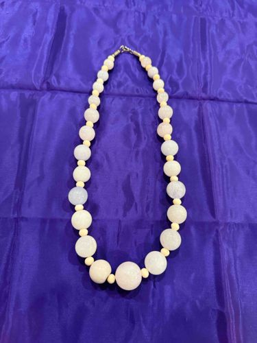 This is a vintage graduated bead necklace featuring semi-translucent, frosted glass beads with internal white swirls, commonly referred to as 'givre' glass. The necklace is constructed with a series of spherical glass beads that increase in size toward the center, anchored by a large focal bead at the bottom. Between each glass bead is a small, cream-colored spacer bead, likely made of early plastic such as celluloid or bakelite. The glass beads exhibit a subtle cool-toned hue, possibly light blue or grey, which contrasts with the warmth of the spacers. The necklace is secured with a simple silver-toned barrel or spring ring clasp. The craftsmanship suggests a mid-20th-century origin, likely 1940s to 1950s costume jewelry. The condition appears fair with visible patina on the metal findings and slight yellowing to the spacer beads consistent with age. There is no visible sign of maker's marks in the image. The overall length appears to be approximately 18 to 20 inches, resting on a purple satin-like background which highlights the translucency and matte finish of the glass components.