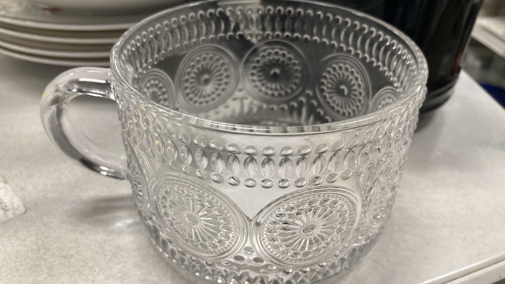 This is a large-format clear glass cup or mug, potentially used for coffee or soup, featuring intricate embossed decorative elements. The piece is constructed from thick, pressed soda-lime glass, characterized by its substantial weight and durability. The exterior body is adorned with a repetitive pattern of circular sunburst or floral medallions, framed by bead-like textures and rows of scalloped or petal-shaped indentations. A series of small vertical ridges lines the upper rim, while the base features a complementary beaded border. The handle is a simple, clear C-shaped loop, seamlessly integrated into the side of the vessel. The style is reminiscent of early to mid-20th-century American pressed glass (Early American Pattern Glass) but is likely a contemporary reproduction or modern houseware item designed with vintage aesthetics. The glass exhibits high clarity with no visible chips, cracks, or significant clouding, though there is a small yellowish droplet of residue on the handle. The absence of visible maker's marks or pontil scars suggests modern industrial manufacturing via a mold process.