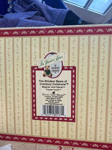 This is a collectible gift box produced by Papel Giftware, specifically for 'The Windsor Bears of Cranbury Commons' series. The featured item is titled 'Meghan and Daniel' from the 'Forever Yours' collection, identified by Item No. 80137. The packaging consists of a heavy-duty cardboard box with a cream and beige striped background pattern featuring decorative vine-like scrolls. It is bordered by deep burgundy or red bands with white fan and dot motifs, giving it a classic, traditional aesthetic popular in the late 1990s and early 2000s. The central label includes a high-quality graphic of a teddy bear wearing a green sweater and carries the brand’s trademarked logos. According to the manufacturing details on the sticker, the bear was made in China, while the box was printed in Taiwan. The box appears to be in good vintage condition, though some minor edge wear and light surface foxing on the cardboard are visible, consistent with age. This piece is representative of mass-marketed collectibles designed for sentimental gifting and home decor during its era of production.