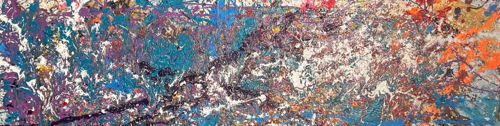 This item is a horizontal rectangular abstract painting executed in the Abstract Expressionist style, reminiscent of the 'action painting' technique. The composition is characterized by a dense, multi-layered application of paint involving drips, splatters, and gestural sweeps across a light-colored ground. The palette is diverse and vibrant, featuring prominent shades of cerulean blue, violet, rich magenta, and burnt orange, contrasted against neutrals such as off-white, grey, and deep black. The materials appear to be acrylic or enamel paints on a flat substrate, likely canvas or a prepared panel. Physically, the artwork exhibits a complex impasto texture where thick droplets of paint have dried in relief, creating a tactile surface. There is a sense of dynamic movement indicated by the diagonal trajectories of black and white splashes that bisect the frame. The condition appears stable with no immediate signs of flaking or cracking visible in the provided view, suggesting a contemporary or well-preserved mid-to-late 20th-century origin. The craftsmanship reflects a high degree of control within a seemingly chaotic process, showing sophisticated over-layering that provides depth and visual complexity. No visible artist signature or maker's marks are present in this specific crop, though the style suggests an artist working in the tradition of Jackson Pollock or his contemporaries.