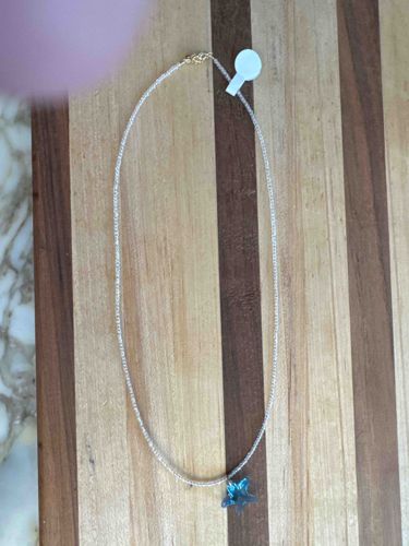 This is a fine-beaded necklace featuring a distinctive blue Swarovski crystal star pendant at the center. The necklace strand is composed of minute, uniformly sized clear or iridescent beads, which provide a delicate and subtle shimmering effect. The pendant is a five-pointed star crafted from high-quality faceted blue crystal, exhibiting the precision cutting associated with the Swarovski brand to maximize light refraction and depth of color. Based on the provided physical context, the jewelry incorporates premium materials including a sterling silver base for the structural elements and a 14kt gold clasp for the closure mechanism, adding significant value and durability. The clasp appears to be a standard spring ring or lobster style. The overall design suggests a contemporary or late 20th-century style, prioritizing minimalist elegance. The condition appears excellent with no visible chips to the crystal pendant or fraying of the bead strand. The workmanship displays high attention to detail in the bead alignment and the mounting of the pendant. A white pricing or inventory tag is attached to the upper right side of the strand, suggesting the item is in unused or retail-ready condition.