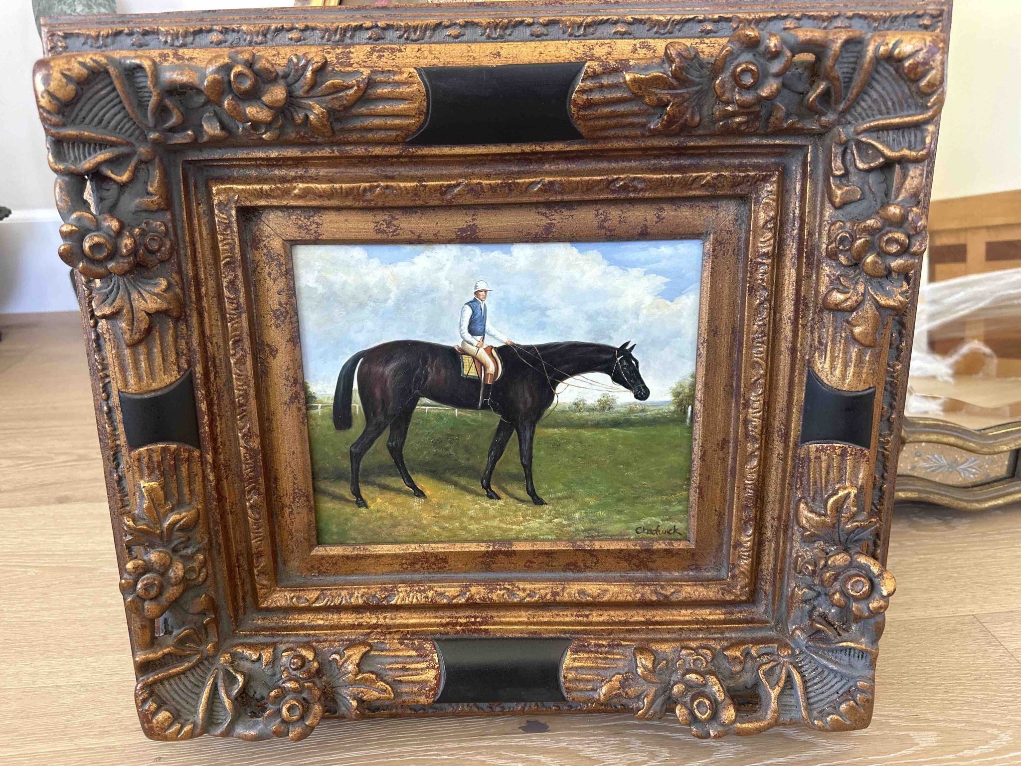 This is a fine equestrian oil painting on board, executed in a traditional 19th-century sporting style. The artwork depicts a dark bay or black thoroughbred racehorse in profile, mounted by a jockey wearing a white helmet, blue vest, and white breeches. The scene is set against a serene landscape of green rolling hills and a light blue sky with puffy white clouds. The artist's signature, 'Chadwick', is clearly visible in the lower right corner, typically associated with contemporary artists working in the classical British sporting tradition. The painting is housed in an exceptionally ornate, heavy gilt-wood and composition frame. The frame features high-relief floral carvings and fluted pilaster elements, accented with inset matte black lacquered panels at the center of each rail. The frame's finish exhibits an intentional antiqued patina with sporadic darker rubbing to simulate age. The painting appears to be in excellent condition with no visible surface cracking (craquelure) or pigment loss. The frame shows minor surface dusting but remains structurally sound with no significant chips or losses to the gesso ornamentation. This piece captures the classic aesthetic of English turf paintings with modern precision.