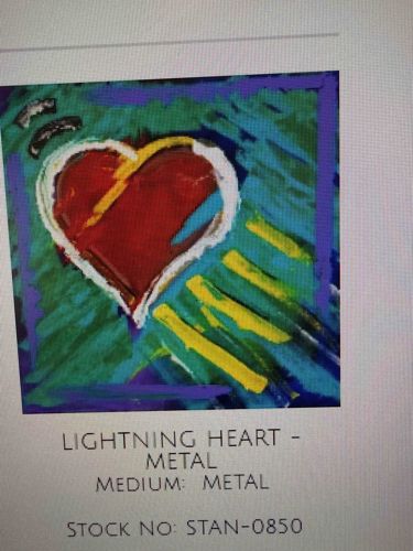 This is a vibrant artwork titled 'Lightning Heart' by the renowned Pop Artist Peter Max, specifically formatted as a metal print. The piece showcases Max's signature Neo-Expressionist style, featuring a central red heart outlined in white and yellow, set against a dynamic background of Teal, Green, and Deep Blue gestural brushstrokes. Four distinct yellow 'lightning' bolts or streaks dynamic radiate from the bottom right of the heart, giving the piece its namesake energy. The artwork is framed by a bold purple border. As a metal print, the medium offers a sleek, industrial finish where the pigments are infused into the surface of a metal sheet, typically aluminum, resulting in a high-gloss, durable, and luminous appearance. The craftsmanship is characterized by high-intensity color saturation and crisp linework typical of modern digital reproduction techniques used for contemporary Pop Art editions. The condition appears sound based on the digital preview, showing no visible scratches, denting, or oxidation on the metal surface. This piece represents the late 20th to early 21st-century aesthetic of Max's later career, emphasizing cosmic and emotive themes with a bold, graphic sensibility. The image includes identifying text below the artwork: 'LIGHTNING HEART - METAL', 'MEDIUM: METAL', and 'STOCK NO: STAN-0850', which are likely internal inventory identifiers from a gallery or a publisher like Park West Gallery.