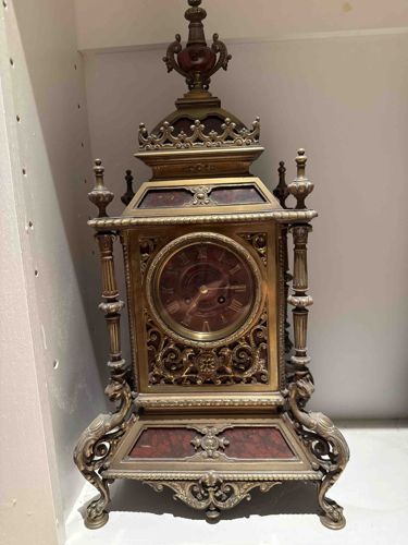 This is an ornate mantel clock designed in the French Renaissance Revival style, likely dating from the mid-to-late 19th century (circa 1870-1890). The clock case is primarily constructed from cast gilt bronze with decorative inlays of reddish-brown variegated marble or faux-marble porphyry panels. The structure features a complex architectural form with an elaborate tiered top topped by an urn-shaped finial and openwork gallery. The main body is flanked by fluted Corinthian-style columns and rests on an integral flared base with intricate scrolling foliate feet. The clock face features a brass or bronze dial with Roman numerals set against a recessed reddish-brown center, protected by a glass crystal. The overall metalwork is highly detailed, showcasing master craftsmanship in the pierced scrollwork and decorative friezes. Condition-wise, the piece shows a significant age-related patina with some dulling of the original gilt finish and surface dust in recessed areas. There are no major visible cracks in the marble panels, but there is noticeable tarnishing on the columns and base consistent with handled bronze. The movement functionality is undetermined from the image, but the presence of two winding holes indicates a strike and time-keeping mechanism, likely of French origin given the stylization. The clock stands as a prime example of eclectic 19th-century luxury horology designed for high-end domestic interiors.
