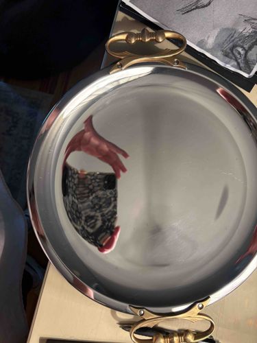 This is a circular serving tray manufactured by Kronex, likely dating from the mid-20th century (circa 1950s-1970s). The tray is constructed from high-quality polished stainless steel, featuring a mirror-like finish on the interior surface and a slightly raised rim for containment. It is equipped with two distinctive decorative handles mounted with rivets at opposite sides. These handles appear to be made of cast brass or gold-toned metal, featuring a stylized bow or scroll-like design with three central spherical beads, evoking a Regency or Hollywood Regency aesthetic. The contrast between the cool, silver-toned steel and the warm, gold-toned handles is a classic design hallmark of the period. In terms of condition, the tray shows visible surface abrasions and light scratches consistent with domestic use and cleaning over time. There are no major dents or deformities visible, and the handles remain securely attached. Based on the user's information, the piece is marked 'Kronex Made in USA'. The craftsmanship is indicative of durable American-made kitchenware intended for both functional service and decorative display.