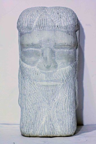 This is an original freestanding stone sculpture depicting a stylized human head with a full beard and textured hair. The piece is hand-carved from a single block of light grey stone, possibly soapstone, alabaster, or a soft limestone, exhibiting a matte, slightly granular surface finish. The sculpture stands roughly rectangular in its overall silhouette, with a flat base for display. The facial features are minimalist and primitive in style, characterized by narrow, closed slit-like eyes, a prominent yet simplified nose, and a thin, horizontal mouth line. Significant emphasis is placed on the repetitive vertical striations that define the beard and the shorter, tighter vertical lines representing the hair or a cap across the forehead. These incised textures provide a stark contrast to the smoother, polished planes of the cheeks and forehead. While the artist is unknown, the work reflects a mid-to-late 20th-century modernist or folk-art influence, prioritizing form and texture over anatomical realism. The condition appears stable with minor surface abrasions, a faint patina consistent with handling, and small chips along the bottom edge, characteristic of soft stone carvings of this age. No visible maker's marks or signatures are apparent on the frontal view. The craftsmanship demonstrates a purposeful use of chisel and rasp techniques to create a somber, totemic aesthetic.