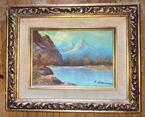 This is an original landscape painting executed in acrylic on canvas, measuring 10 3/8 inches wide by 8 1/2 inches high including the frame. The artwork depicts a tranquil mountain scene featuring a jagged peak in Northern European or North American style, overlooking a calm body of water that reflects the sky. The color palette utilizes cool blues and teals in the sky and water, contrasted by earthy browns and ochres in the foreground rocky shore and mid-ground foliage. The application of paint shows visible impasto, particularly on the mountain peaks and shoreline, suggesting a textured, painterly approach common in late 20th-century decorative art. A clear signature 'R. Blummer' is located in the lower right corner in dark pigment. The piece is housed in a contemporary gold-finished ornate composite frame with a fabric-covered inner liner (linen slip). The frame features a scrolled acanthus leaf motif and shows minor signs of aging such as small scuffs on the corners. Despite being dated to 2002, the style echoes mid-century scenic landscapes often produced for commercial galleries. The overall condition appears good with the canvas tension remaining taut and no visible crazing or paint loss.