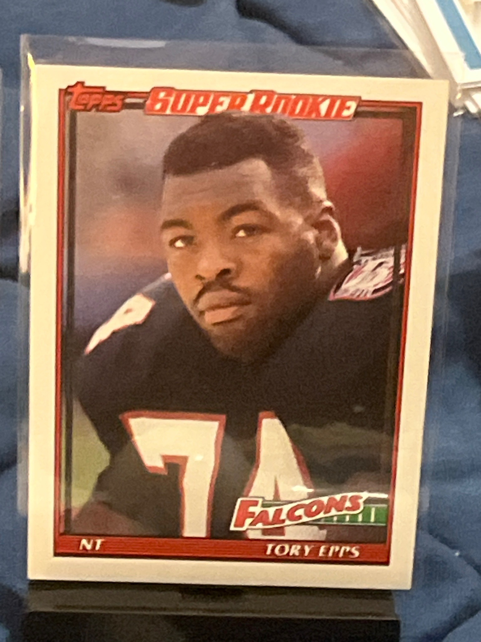 This is a 1991 Topps American football trading card featuring nose tackle Tory Epps of the Atlanta Falcons, specifically identified as a 'Super Rookie'. The card follows the standard 2.5 by 3.5 inch dimensions typical of the era, constructed from cardstock with a semi-gloss finish. The front design is characterized by a thick white outer border surrounding a thin red inner frame. At the top left is the Topps company logo, joined by the 'SUPER ROOKIE' banner in a slanted, bold red font. The bottom of the card displays a red bar containing the player's position 'NT' and name 'Tory Epps', along with a green Falcons team logo overlay. The image shows a close-up portrait of Epps wearing his black Atlanta Falcons home jersey with white and red numbering. The card appears to be in excellent condition, housed in a protective clear plastic sleeve. The centering of the image within the white borders looks relatively balanced, with sharp corners and no visible surface abrasions, creases, or discoloration. The printing quality is characteristic of early 1990s mass-production, showing deep colors and clear text. This card represents the 'Junk Wax Era' of sports collectibles, a period known for high production volumes.