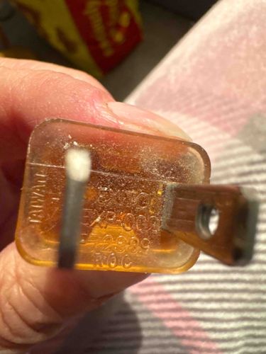 This is a two-pronged, non-polarized AC electrical power plug, likely from the late 20th century (circa 1980s-1990s). The item features a distinct translucent amber or gold-toned plastic/polycarbonate housing. The construction includes two nickel-plated or steel flat metal blades protruding from the base, one of which appears slightly tarnished or oxidized. The plastic housing is embossed with identification markings including 'TAIWAN', 'R.O.C.' (Republic of China), and a series of alphanumeric codes: 'EP-002' and 'E72989'. These markings indicate industrial mass production for the international electronics market. Physically, the plug shows significant signs of age and use, including a thick layer of accumulated dust and grease on the top surface, minor abrasions to the plastic, and light patina on the metal prongs. The rectangular body has rounded corners, a characteristic of consumer-grade electrical components from this era. Overall, the item is a standard utility piece, functional rather than decorative, though its translucent gold color is a specific aesthetic choice common in vintage household electronics.
