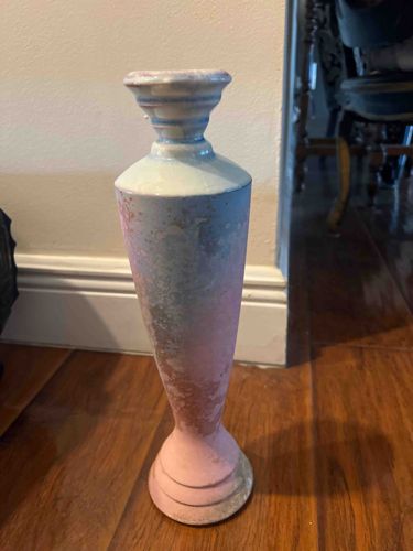 This is a tall, slender bud vase crafted from ceramic, exhibiting a mid-to-late 20th-century modernist aesthetic. The vessel features a tapered, conical body that widens slightly at the shoulders before meeting a faceted or tiered neck and a flared, flat rim. The base is notably stylized with concentric ring-like tiers that provide stability to its elongated form. The exterior finish is the most striking feature, displaying a multi-tonal, mottled glaze consisting of gradient shades of dusty pink, pale blue, and off-white. This color palette suggests a 'shabby chic' or postmodern influence, likely dating from the 1980s or 1990s. The glaze has a matte to semi-satin texture with visible distressing, though it is unclear if the surface spotting is part of the original firing process (such as a crawl glaze or salt-fire effect) or subsequent environmental wear. Notable condition issues include visible surface dirt, potential mineral deposits near the base, and minor abrasions consistent with age and display on a hard surface. The craftsmanship appears to be hand-turned or mold-cast studio pottery, characterized by its unique silhouette and expressive application of color. No maker's marks are visible on the upper body, suggesting any identification would likely be found on the underside of the base.