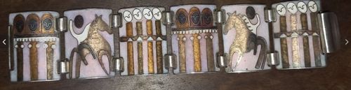 This is a significant French modernist link bracelet, attributed to the workshop of Mithé Espelt, dating to approximately the 1950s or 1960s. The piece consists of six rectangular, slightly curved panels joined by sturdy silver hinge links. The base metal appears to be high-grade silver or silver-plated copper, common for artisanal French jewelry of this era. The decorative technique is cloisonné or champlevé enamel on a white and light pink ground, featuring a stylized equestrian and architectural motif. The design oscillates between depictions of horses with riders and abstract columns topped with mask-like faces or shields. The color palette is sophisticated, utilizing earthy ochre, deep black, and shimmering gold lustres against the soft pastel background. Each panel measures approximately 1 inch in height, creating a bold 'cuff' aesthetic. The craftsmanship is high, evidenced by the consistent firing of the enamel and the integration of metallic foils for depth. Condition-wise, the bracelet shows minor age-related oxidation to the silver hinges and slight surface abrasions consistent with wear. There are no visible major cracks or chips in the enamel panels, which preserves the item's integrity. The toggle or fold-over clasp is integrated seamlessly into the design. Such pieces are highly collectible examples of the South of France ceramic and enamel movement.