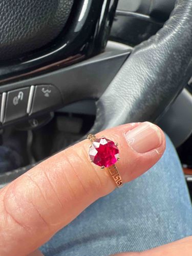 This is a solitaire statement ring featuring a large, vibrant round-cut red gemstone, identified by the user as a 1.5-carat center stone. The gem exhibits a deep pigeon-blood red hue with visible brilliance and is secured in a classic six-prong setting. The mounting is crafted from 14k yellow gold, characterized by a unique and decorative shank. The shoulders of the ring are embellished with an open-work Greek Key (meander) motif, which adds a classical or Mediterranean stylistic influence to the piece. The band narrows toward the back and appears to have a polished finish. In terms of condition, the prongs appear intact and well-aligned, though the gemstone's surface should be inspected under magnification for any facet wear or abrasions common with older pieces. The metal shows minor signs of surface wear consistent with light use. The craftsmanship is notable for the precision of the cast geometric pattern on the shank. While internal hallmarks are not visible in the photo, the provided context indicates a 14k gold purity. The style suggests a late 20th-century vintage aesthetic, possibly from the 1980s or 1990s when bold gemstone solitaires and geometric motifs were prevalent in jewelry design.