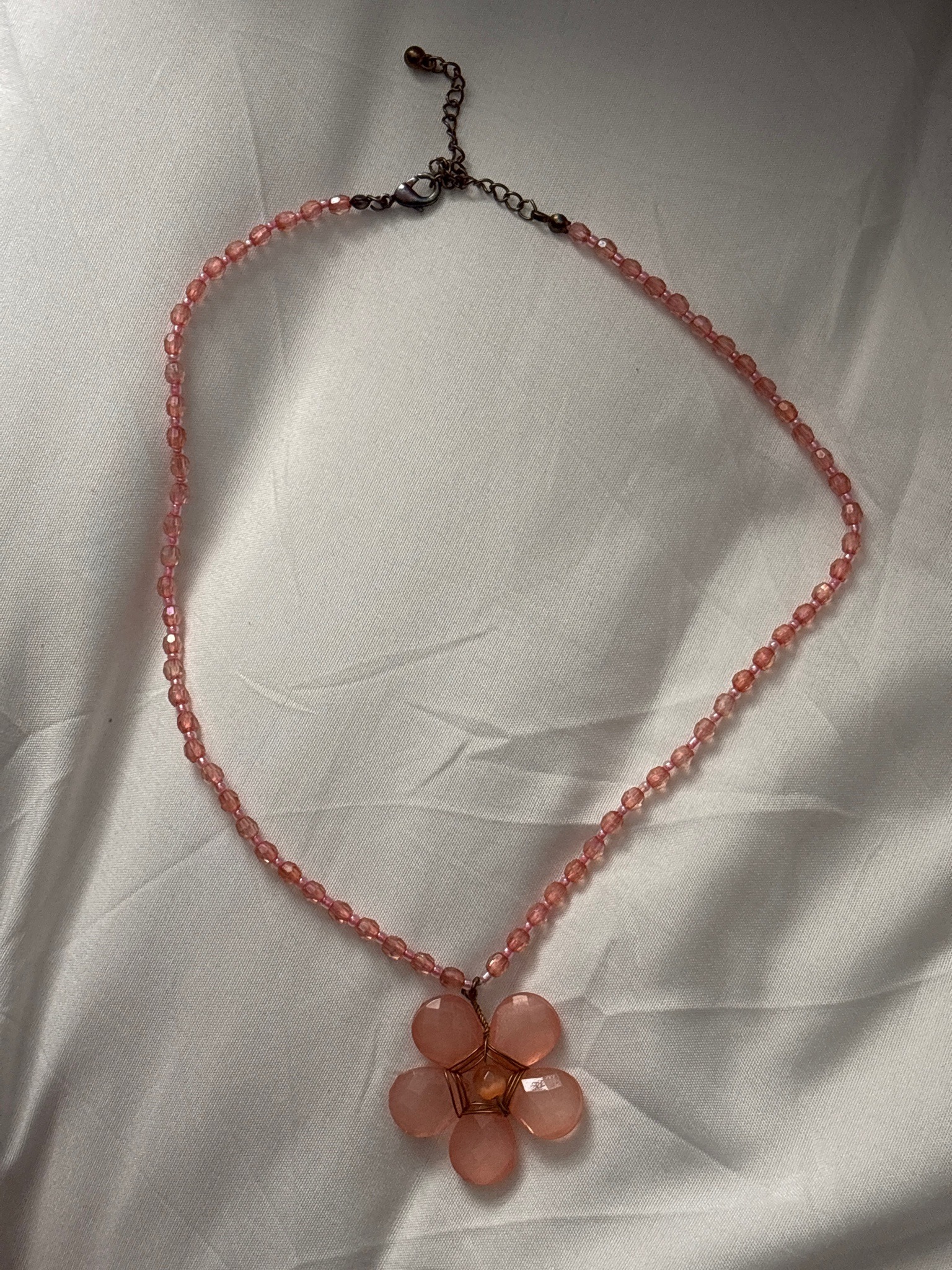 This item is an artisanal necklace featuring a prominent floral pendant suspended from a strand of faceted beads. The necklace is approximately 18 to 20 inches in length, constructed with small, translucent peachy-pink faceted glass or acrylic beads. The focal point is a handmade flower pendant crafted from five large, teardrop-shaped peach-colored cabochons, likely made of glass or semi-precious stone like rose quartz, secured by a copper-toned or oxidised wire-wrapping technique. A smaller round bead sits at the center of the flower to represent the stamen. The hardware consists of an antique-finish bronze or copper-tone lobster claw clasp with a matching extender chain, finished with a small teardrop-end bead. The overall style is characteristic of contemporary hand-crafted or 'Boho' boutique jewelry from the late 20th to early 21st century. The condition appears good with no missing beads visible, though the wire wrapping on the pendant shows slight asymmetry characteristic of manual assembly. The metal components show an intentional aged patina. There are no visible maker's marks or stamps on the clasp or extender chain.