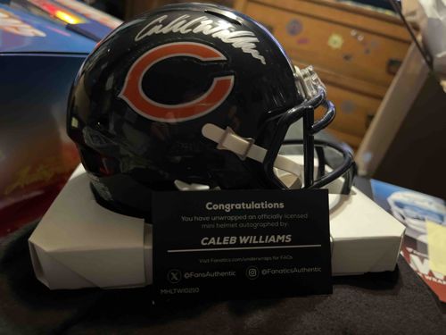 This item is an officially licensed Chicago Bears mini-football helmet, manufactured by Riddell in their 'Speed' style. The helmet features a high-gloss navy blue finish consistent with the modern team aesthetic, adorned with the iconic 'Wishbone C' logo in orange and white on the side. The shell is constructed from molded plastic with a matching navy blue facemask, white chin strap accents, and internal padding replicas. A prominent autograph by 2024 first-overall NFL draft pick Caleb Williams is located on the upper crown in silver paint pen, displaying a clear, legible stroke. The condition appears to be mint or near-mint, with no visible surface scratches, scuffs, or decal peeling. The item is accompanied by a black 'Congratulations' card from Fanatics Authentic, confirming it was obtained through an officially licensed 'unwrapped' memorabilia program. This provenance is critical for modern sports collectibles, ensuring authenticity from a major industry distributor. The craftsmanship of the mini helmet retains excellent scale proportions of an on-field Speed helmet, including the distinct top ventilation holes and earhole contours. Given Williams' status as a top prospect, this piece represents a contemporary premium sports collectible with significant interest in the current memorabilia market.