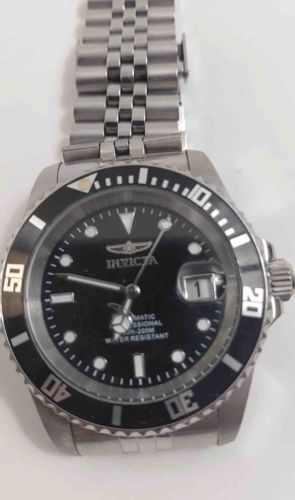 This is a stainless steel Invicta Pro Diver automatic wristwatch featuring a design heavily inspired by classic luxury dive watches. The watch case is approximately 40mm in diameter, crafted from brushed and polished stainless steel. It features a unidirectional rotating bezel with a black aluminum insert, marked with a 60-minute silver-tone scale and a luminous pip at the 12 o'clock position. The black dial showcases luminous circular and rectangular hour markers and the Invicta logo below the 12 o'clock position. The hands are Mercedes-style with a sweeping second hand, all treated with luminous material for low-light visibility. A date window is positioned at 3 o'clock, magnified by a cyclops lens on the mineral crystal. The text on the dial identifies it as an 'Automatic' movement with 'Professional' water resistance of '660ft - 200M'. The watch is fitted with a stainless steel five-link jubilee-style bracelet with a folding clasp. Condition-wise, the watch shows signs of regular wear, including light scuffs and surface scratches on the bezel and bracelet. The crystal shows some surface smudging but remains intact. This model is a contemporary production, likely from the late 20th to early 21st century, known for providing a high-style aesthetic at an accessible price point.