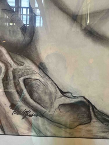 This original work of art is an abstract expressive composition executed in a mixed media of charcoal and what appears to be pastel or light watercolor wash on paper. The piece is characterized by its fluid, organic forms and a monochromatic color palette dominated by shades of grey, black, and off-white/cream, with subtle hints of blue and brown tones. The artist utilizes bold, gestural outlines to define voluminous, rock-like or anatomical shapes, creating a strong sense of depth and three-dimensionality through skilled shading and blending techniques. A prominent artist's signature is visible in the lower left-hand quadrant, rendered in a dark, thick medium that stands out against the lighter background. The work is professionally framed behind glass, which shows significant reflections in the provided image. Regarding the condition, the paper exhibits some slight tonal variations, and there are small dark marks or possibly foxing spots visible near the lower-left edge. The application of the medium shows varying degrees of texture, from soft, smudged shadows to sharp, aggressive line work representing high-quality craftsmanship in the Abstract Expressionist style. Based on the stylistic elements and the nature of the signature, the piece likely dates from the late 20th century, possibly the 1970s or 1980s. The scale is medium-sized, though specific dimensions are obscured by the close-up nature of the photograph.