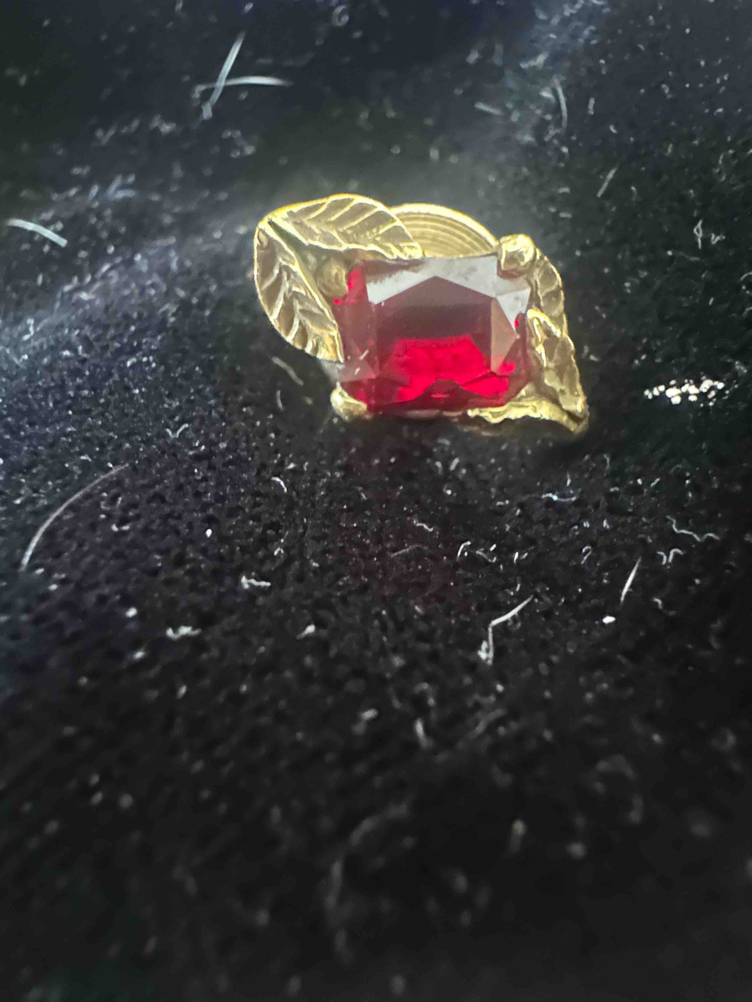This item is a vintage-style decorative pin or brooch featuring a large, central emerald-cut red glass stone designed to simulate a ruby. The stone is deep crimson in color with visible facets and is secured by a series of textured gold-tone metal leaves that serve as decorative prongs. The leaves exhibit fine veining and a semi-matte finish, characteristic of mid-20th-century costume jewelry aesthetics. The overall construction appears to be a base metal plated in gold-tone wash. Regarding condition, there is visible surface wear to the facets of the 'ruby' stone, including small chips along the crown facets and edges where the gold-toned setting meets the glass. The metalwork shows signs of aging with minor patina and loss of plating on the high points of the leaf textures. No visible maker's marks are discernible from the primary viewing angle, but the style is reminiscent of 1950s-1960s production. The craftsmanship is typical of commercial fashion jewelry of the era, focusing on bold colors and nature-inspired motifs. The mounting is sturdy though the setting suggests mass-production rather than artisanal goldsmithing.