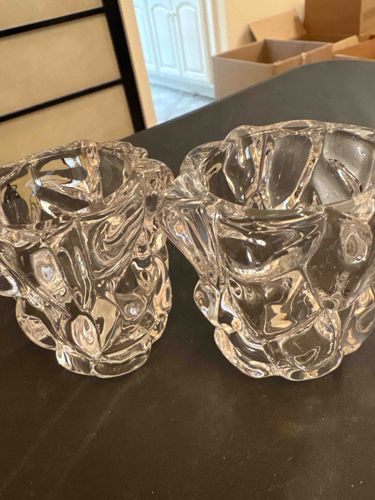 A pair of heavy, clear fine crystal votive candle holders, identifiable as the 'Raspberry' pattern designed by Anne Nilsson for the Swedish glassmaker Orrefors. These high-quality lead crystal pieces feature a distinctive globular and bubbled surface texture intended to mimic the appearance of a berry. The construction is thick-walled with a high refractive index, allowing for significant light play and brilliance when a candle is lit inside. Each vessel measures approximately 2.75 inches in height and 4 inches in diameter. The rim is irregular and undulating, following the organic berry motif. In terms of condition, the crystal appears clear with no visible 'clouding' or sickness. There are no significant chips or cracks apparent in the photograph, though minor surface scratches on the bottom (shelf wear) are typical for this age and material. These pieces were likely manufactured in the late 20th century, as the Raspberry collection was introduced in the 1990s. The craftsmanship is excellent, characterized by a smooth, flame-polished finish and a substantial heft that denotes premium Swedish glass production.