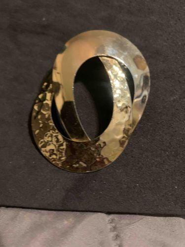This is a vintage-style modernist brooch featuring a sculptural, interlocking double-oval design. The item is constructed from metal with a warm yellow-gold tone finish. Its physical characteristics are defined by a contrast in textures: one oval segment displays a high-polish, smooth reflective surface, while the overlapping segment features a hand-hammered or dimpled 'martelé' texture. This juxtaposition creates a dynamic play of light across the piece. The overall form is a stylized infinity or twist loop, typical of mid-to-late 20th-century costume jewelry aesthetics (circa 1980s-1990s). In terms of condition, there is visible surface wear including fine hairline scratches on the polished sections and some minor tarnish or oxidation consistent with age. Metal plating appears intact but reflects a soft patina. While no maker's mark is visible from the front, the quality of the stamping and the clean edges suggest a well-manufactured mass-market or bridge jewelry brand. The craftsmanship showcases intentional asymmetric balance and a bold, chunky silhouette suitable for outerwear or heavy fabrics.