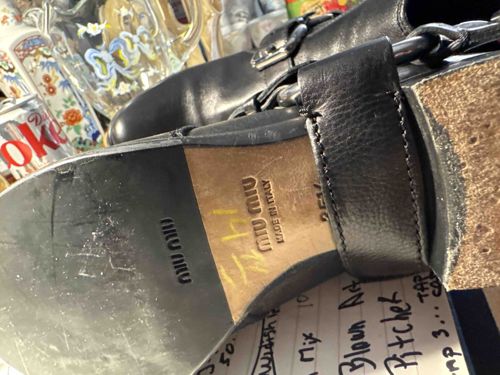 This pair of Miu Miu designer ankle boots is crafted with high-quality, fine-grained black leather uppers, featuring prominent leather straps and gunmetal or silver-tone buckle hardware. The boots exhibit a rugged yet chic aesthetic, typical of the Prada-owned brand. The soles are a combination of leather and rubber, prominently displaying the 'miu miu' logo heat-stamped into the leather waist of the sole, accompanied by the 'MADE IN ITALY' mark and a sizing of 39 1/2. The outsole has a black protective rubber forepart with additional branding. The chunky, stacked heel shows a textured, possibly distressed finish, common in late 2010s to early 2020s fashion footwear. Condition-wise, the soles show significant signs of wear including scuffing, scratches, and a handwritten yellow grease pencil price mark, likely from a resale or thrift environment. The leather uppers show light creasing consistent with use. The stitching reflects luxury craftsmanship with even, heavy-duty threads used on the harness-style straps.