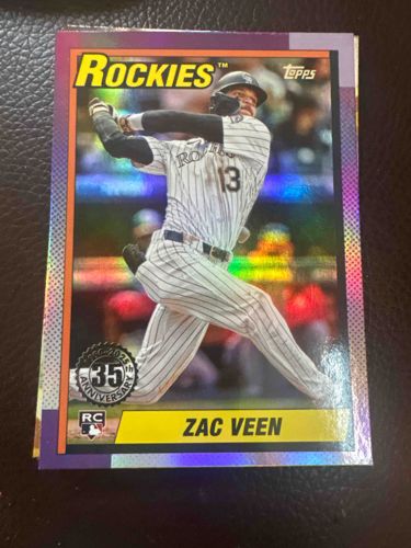 This is a 2023 Topps Series 1 Zac Veen baseball card, featuring a retro design celebrating the 35th anniversary of the 1988 Topps set. The card is a 'Silver Foilboard' parallel, characterized by its shiny, reflective surface that produces a rainbow-like prism effect when it catches the light. Veen is depicted in his Colorado Rockies road pinstripe uniform in a full-swing follow-through action shot. The card features the 'Rockies' logo in yellow at the top left, the Topps logo at the top right, and Zac Veen's name in a yellow bar at the bottom. A circular '35th Anniversary' stamp is located in the bottom left corner, along with the official 'RC' (Rookie Card) shield. The card is standard size (2.5 by 3.5 inches) and printed on a thick, premium cardstock. In terms of condition, the corners appear relatively sharp, though the top right corner shows a slight touch of wear. The centering looks slightly heavy toward the left and bottom borders. The surface shows high gloss with no major visible scratches or print lines in the provided image. This modern collectible pays homage to the 'junk wax' era aesthetics while utilizing modern high-end printing techniques.