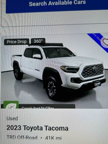 This item is a 2023 Toyota Tacoma mid-size pickup truck in the TRD Off-Road trim level, finished in a classic white exterior paint with black accents. The vehicle is a four-door double cab configuration featuring a short bed. Key physical characteristics include the signature hexagonal mesh grille with a prominent chrome Toyota emblem, black fender flares, and specialized TRD off-road alloy wheels finished in black and machined metal. The vehicle is equipped with an aftermarket low-profile roof rack, adding to its utilitarian aesthetic. Notable features include LED daytime running lights, fog lamps, and standard TRD Off-Road hardware such as Bilstein shocks and skid plates (implied by trim). The exterior appears to be in excellent used condition with high-gloss paint and no visible major dents or scratches. The digital listing indicates the vehicle has 41,000 miles, which is relatively high for a single year of use but consistent with a well-maintained modern commuter or travel vehicle. This 2023 model represents the final year of the third generation (N300) Tacoma, reflecting peak manufacturing refinement for this specific body style. The craftsmanship is typical of Japanese industrial standards, prioritizing durability and resale value.