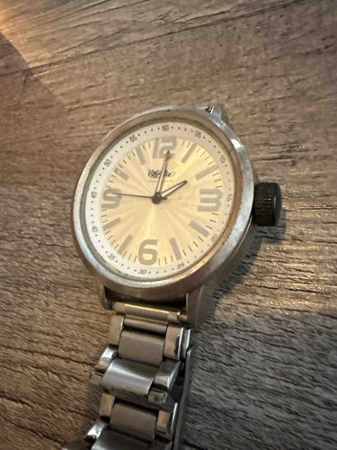 This is a contemporary men's fashion wristwatch by the brand Mossimo. The timepiece features a large, round stainless steel-toned base metal case with a distinctively oversized black textured crown at the 3 o'clock position. The dial displays a silver-toned sunburst or radial etched pattern, complemented by large, stylized Arabic numerals at the 3, 6, 9, and 12 positions, with simple baton indices for the remaining hours. An outer minute track ring is printed with small numerical intervals from 05 to 60. The watch is powered by a quartz movement and features a three-hand analog display. It is attached to a matching brushed silver-colored stainless steel multi-link bracelet band. Regarding condition, the watch shows significant signs of wear consistent with regular use, including visible surface scratches on the bezel and lugs, noticeable grime and pocket wear in the link crevices, and some minor scuffing on the crystal. The oversized crown's black plating appears slightly worn at the edges. This represents a mid-to-late 2000s mass-market fashion accessory, prioritized for bold lifestyle aesthetics rather than luxury horological value.