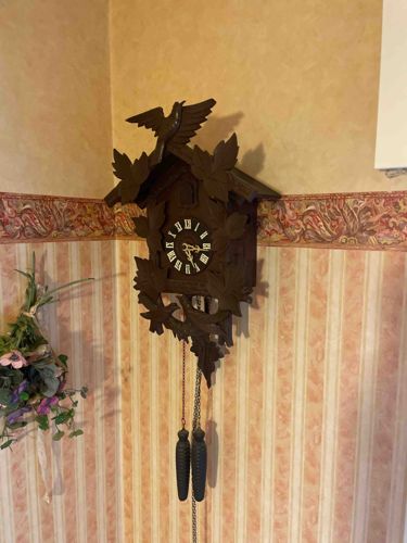 This is a classic 'Bird and Leaves' style Black Forest cuckoo clock, likely of German origin, dating from the mid-to-late 20th century. The case is constructed from hand-carved linden wood with a dark walnut-stained finish. The architectural design features a gabled 'chalet' roof topped by a cresting bird with outspread wings. Five distinct maple-style leaves are carved around the clock face, with two additional birds perched at the bottom. The clock face is dark with applied Roman numerals and ornate white-finished hands, providing high contrast for legibility. Below the case, two cast-iron weights in the traditional pinecone shape are suspended by metal chains, which drive the mechanical movement. A cuckoo bird aperture is visible behind a small door at the peak of the case. The carving displays deep relief and crisp detailing typical of artisanal craftsmanship. The condition appears fair to good; there is a visible layer of surface dust and slight darkening of the wood patina, but the carvings appear intact without obvious losses. One chain hangs significantly longer than the other, suggesting the clock is either currently running or requires winding. The overall construction reflects the traditional folk-art style of the Triberg or Neustadt regions of Germany.