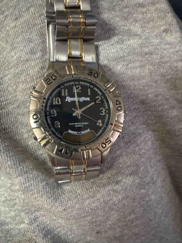 This is a men's ana-digi wristwatch featuring a two-tone stainless steel construction. The watch face is black with Arabic numeral hour markers and the 'Remington' brand logo prominently displayed below the 12 o'clock position. The dial includes a narrow digital LCD display window at the 6 o'clock position, indicating a dual-function capability common in hunting or field style watches. The text on the dial identifies it as '3ATM WATER RESIST' and 'QUARTZ'. The bezel is silver-toned with embossed numerical minute markers (10, 20, 30, 40, 50) and ribbed decorative accents. The bracelet is a multi-link style with silver-toned brushed outer links and gold-toned polished center accents. In terms of condition, the piece shows significant signs of wear and age; there are visible surface scratches and 'scuffs' on the metal bezel and crystal case. The gold plating on the bracelet links shows signs of thinning or wear-through. The overall craftsmanship suggests a mass-produced promotional or entry-level utility timepiece, likely dating from the 1990s or early 2000s. No specific maker's marks beyond the Remington brand are visible on the front.