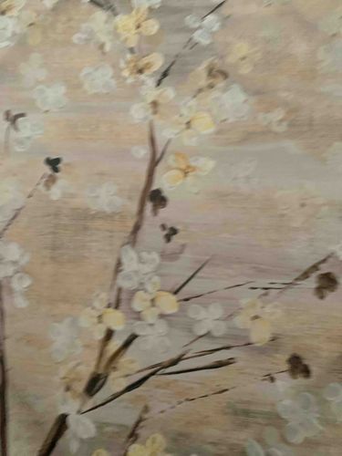 This artwork is a detail from a larger composition, attributed to the iconic American illustrator Norman Rockwell. The piece features a delicate, impressionistic depiction of cherry blossoms or similar spring flowering branches. The color palette is dominated by soft, muted tones including pale creams, butter yellows, and gentle lavenders in the background, which suggest a hazy or atmospheric quality. The branches themselves are rendered with swift, dark brown and ochre brushstrokes, showcasing a confident hand and stylistic versatility often seen in Rockwell's background elements and preparatory studies. The medium appears to be oil or acrylic on a textured substrate, possibly canvas or board, with visible impasto and dry-brush techniques that provide depth and tactile interest. Regarding condition, the surface shows a subtle patina consistent with mid-20th-century origins, with no immediate evidence of significant cracking or paint loss visible in this section. The craftsmanship reflects a high degree of artistic intentionality, where the softness of the petals contrasts sharply with the linear precision of the stems. This specific floral motif is reminiscent of the background details found in Rockwell’s more complex narrative works, such as his studies for magazine covers or personal pastoral scenes from his later period in Stockbridge, Massachusetts.