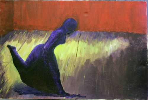 This is an original expressionist-style painting executed on a large-format paper measuring 4526 x 3070 units. The composition centers on a stylized, darkened silhouette of a figure, rendered in deep indigo and violet tones, appearing in a dynamic, leaning posture that suggests movement or dance. The background is bifurcated into a vibrant upper red register and a lower floor area characterized by expressive, diagonal brushstrokes in shades of ochre, yellow, and brown, creating an atmospheric, stage-like setting. The artist utilizes thick, textured paint application with visible impasto and broad strokes, indicative of a mid-to-late 20th-century or contemporary aesthetic. There are no visible signatures or maker’s marks on the face of the work. The paper exhibits slight undulations along the edges and a notable surface indentation or small puncture near the upper center of the red background, suggesting some age and physical handling. The craftsmanship reflects a bold, gestural approach to figurative abstraction, focusing on emotional resonance and form rather than anatomical precision. The play of light and shadow is particularly prominent, with the yellow streaks simulating a spotlight effect that enhances the dramatic quality of the central subject.