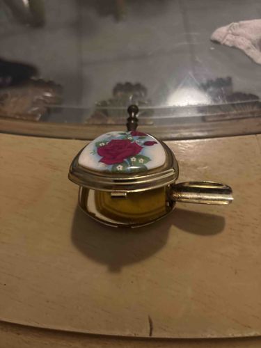 This is a vintage mid-century miniature portable ashtray, commonly referred to as a 'silent butler' style due to its hinged lid design. The piece is constructed from a gold-toned base metal, likely brass or plated metal, featuring a circular body with an attached side handle that doubles as a cigarette rest. The most prominent feature is the domed porcelain or ceramic inset on the lid, which displays a transfer-ware motif of a large deep-pink or burgundy rose surrounded by smaller white blossoms and green foliage against a white background. The lid is operated by a small thumb-lift lever located opposite the handle. The interior appears to have a reflective finish. Condition-wise, the item shows age-appropriate wear, including visible tarnishing and oxidation on the metal surfaces, particularly around the hinges and the handle. Measurement appears to be approximately 2 to 3 inches in width. These items were popular as functional decorative accessories from the 1950s through the 1970s. The craftsmanship is typical of mass-produced mid-century vanity items, designed for desk-top or bedside table use.