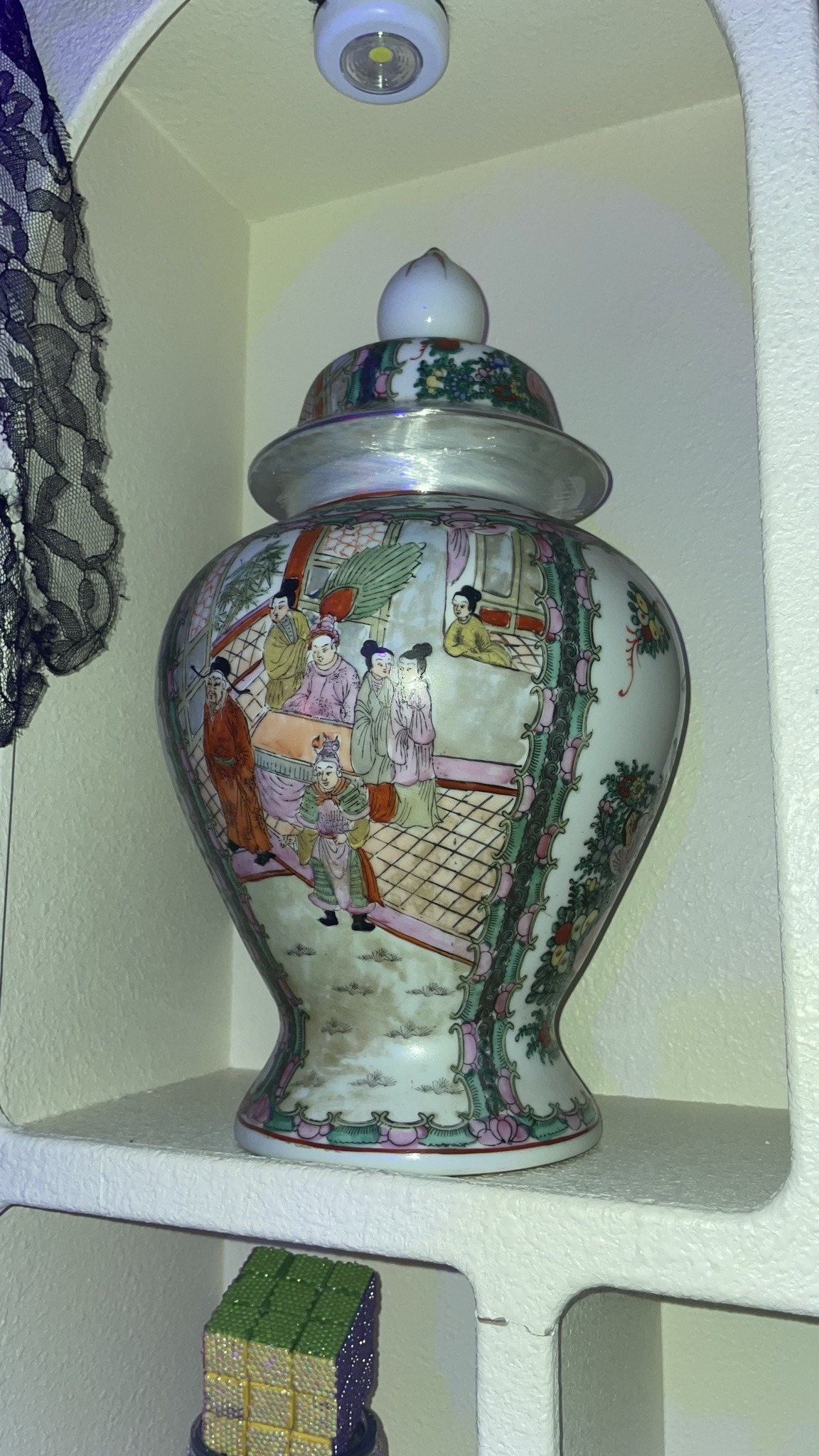 This is a porcelain ginger jar with a matching domed lid topped with a peach-shaped finial, decorated in the traditional 'Rose Medallion' style. The jar features hand-painted decorative panels or 'cartouches' depicting various figures in interior court settings, likely scholar-officials and ladies, rendered in a palette of pink, green, yellow, and iron-red enamels. The primary scene shows a courtyard gathering with figures dressed in classical Chinese robes. Framing these panels are intricate borders of stylized flowers, scrolling vines, and butterflies, characteristic of late 19th to mid-20th-century export porcelain. The glaze appears bright and reflective, though there is visible surface grime and dark spotting near the base, which may indicate atmospheric accumulation or slight firing flaws. The construction follows a typical baluster shape with a flared foot. While the specific maker's mark is not visible in the image, the style and execution suggest a 20th-century production, frequently mass-produced for the Western export market. The overall condition appears stable with no major cracks or chips visible from this angle, though the paint shows minor wear consistent with handling. The quality of the enamel work is utilitarian, with some bleeding of colors and simplified line work compared to high-end 19th-century examples.