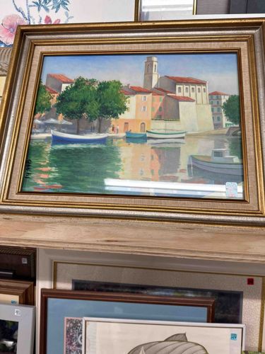 This item is an original oil or acrylic painting on canvas or board, depicting a tranquil European Mediterranean seaside village. The artwork features a cluster of terracotta-roofed buildings, a prominent church tower, and various fishing or rowing boats moored in the foreground. The color palette is bright and atmospheric, utilizing soft blues, warm ochres, and vibrant greens to capture the sunlight and water reflections. The painting reflects a Mid-Century Modern or Post-War impressionistic style, likely dating from the mid-to-late 20th century. The piece is housed in a substantial multi-tiered wooden frame featuring a metallic gold and silver finish with an inner linen-wrapped liner. The frame is a classic cove-style with stepped molding. Notable markings include what appears to be a signature or inventory number on the lower left edge of the artwork. The overall craftsmanship of the frame suggests professional gallery framing. Regarding condition, there is several visible minor abrasions and scuffs along the top and outer edges of the gilded frame, as well as a small white sticker on the lower right of the glass or surface. The painting itself appears to be in stable condition with no immediate evidence of craquelure or pigment loss visible in the photograph. The perspective and light-play indicate a skilled hand following traditional landscape conventions.