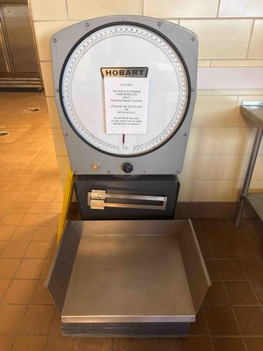 This is a vintage industrial commercial floor scale manufactured by Hobart, a company renowned for high-quality food service equipment. The unit is constructed with a heavy-duty cast metal housing finished in a standard industrial gray enamel. It features a large, glass-covered circular dial display at the top, which includes clear numerical markings and the prominent 'HOBART' logo. Just below the circular dial is a secondary horizontal weight beam for precision balancing. The weighing mechanism is connected to a wide, stainless steel platform with folded side edges designed to contain bulk food items. A printed caution sign is taped to the glass, indicating a maximum capacity of 75 pounds and emphasizing that it is for food products only. The machine shows signs of consistent industrial use, including minor scuffing on the enamel finish and surface wear on the stainless steel platform, though it appears mechanically sound and well-maintained. Based on the design and font style, this unit likely dates from the mid-to-late 20th century. This specific model is valued for its durability, mechanical precision, and the high-end manufacturing standards associated with the Hobart brand.
