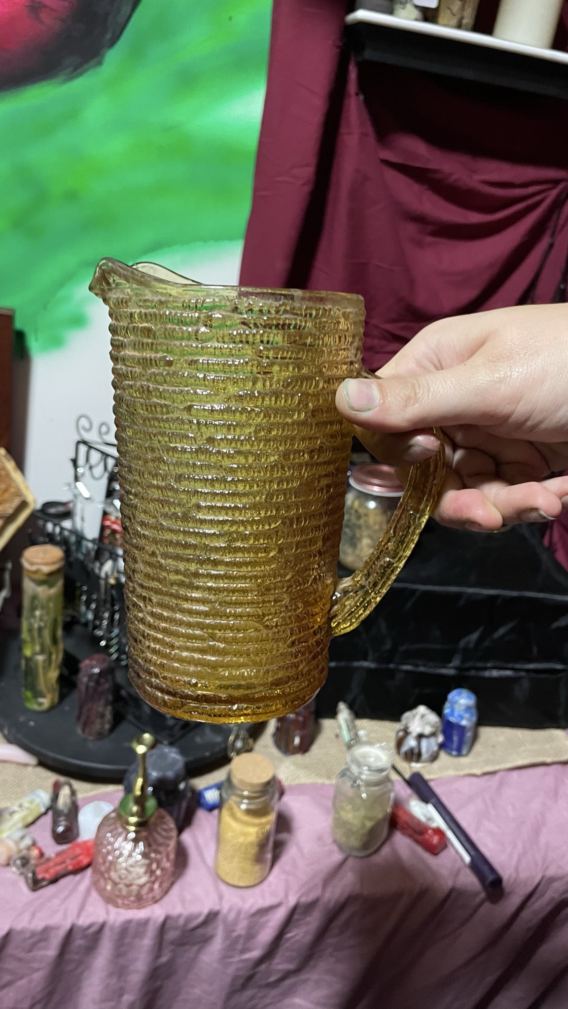 This item is a vintage water or beverage pitcher crafted from thick, translucent amber-colored glass. The piece is characterized by a prominent, tactile exterior texture consisting of horizontal, raised serpentine ribs or 'rope' bands that wrap around the entire cylindrical body. These ridges create a distinctive bark-like or woven appearance often found in mid-century glasswork. The pitcher features a classic ice lip spout for ease of pouring and a large, integrated glass handle that matches the texture and color of the body. Based on the construction and color, it is likely a piece of American or European art glass from the 1960s or 1970s, similar in style to items produced by companies like Indiana Glass (specifically the 'Monticello' or bark patterns) or Kanawha. The condition appears to be very good with no visible chips, cracks, or heavy clouding, though there is consistent light patina reflecting its age. The craftsmanship is robust, designed for both aesthetic appeal and utilitarian durability, with a solid weighted base and a seamless handle attachment that indicates high-quality industrial mold-blowing or pressing techniques.