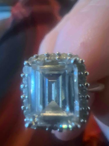 This item is a prominent cocktail ring featuring a large, rectangular emerald-cut center stone. The primary stone exhibits a clear, colorless appearance and is characterized by long, linear facets typical of step-cut geometry, suggesting it may be a colorless gemstone or high-quality stimulant. The center stone is framed by a rectangular 'halo' of approximately 20 to 24 smaller, round-cut accent stones, each individually set with visible metal prongs. The mounting appears to be fashioned from a silver-toned metal, such as white gold, platinum, or sterling silver, though no hallmarks are visible in the provided view. The craftsmanship displays a classic cluster arrangement designed to maximize light return and perceived size. In terms of condition, the stones show high surface luster, though the resolution limits the identification of internal inclusions or abrasions on the facet edges. The setting appears intact without missing accent stones. This style of ring is consistent with late 20th-century to contemporary fine jewelry design, often used for formal wear or engagement pieces. The overall aesthetic emphasizes a 'hall of mirrors' effect within the center stone, contrasted by the brilliant sparkle of the surrounding halo.