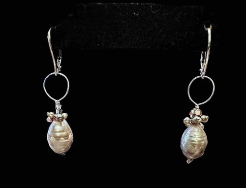 A pair of contemporary artisan-crafted dangle earrings featuring high-luster baroque freshwater pearls as the primary focal points. Each earring is suspended from a sterling silver lever-back ear wire, ensuring security during wear. Below the ear wire, a hand-formed silver wire loop connects to a decorative cluster consisting of faceted Swarovski crystals and small metallic accent beads. The baroque pearls exhibit a natural, irregular egg-shaped form with visible undulating growth rings and a soft silvery-white to cream orient. The luster is moderately high, reflecting light well against the darker backdrop. The construction employs wire-wrapping techniques, specifically seen in the silver wire coiled around the base of the loops. The crystals appear to have an aurora borealis (AB) or metallic finish, providing a modern contrast to the organic shape of the pearls. While specific maker's marks are not visible on the front, the silver components show a bright, polished finish with minimal signs of tarnish. The condition appears to be excellent with no visible chips to the nacre of the pearls or the crystal surfaces. The style is indicative of modern handcrafted bridge jewelry, likely dating from the last 10-15 years.