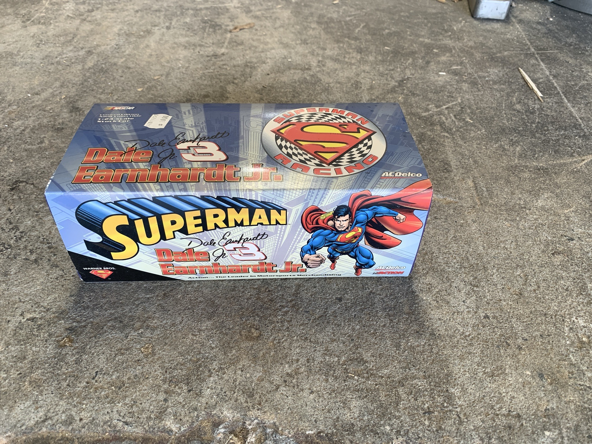 This is a highly collectible 1:24 scale die-cast replica of Dale Earnhardt Jr.'s NASCAR stock car, featuring a special 'Superman Racing' promotional livery from 1999. The item is housed in its original commemorative packaging, which displays vibrant graphic artwork of both the #3 car driver and the DC Comics character Superman. The box is predominantly blue with red and white accents, featuring the iconic 'S' shield inside a checkered flag. A critical value-added feature is the authentic signature of Dale Earnhardt Jr. on the top panel of the box, rendered in black ink. The packaging confirms this is a 'Limited Edition' and an 'Adult Collectible' produced by Action Performance Companies, Inc., known for high-quality craftsmanship in the motorsports industry. The internal vehicle is constructed of heavy-duty die-cast metal with plastic components, meticulous paint application, and accurate sponsor decals including AC Delco and Warner Bros. The box appears to be in exceptional, mint condition with no visible corner dings, color fading, or tearing, preserving the overall value of the piece. The combination of NASCAR history, DC Comics licensing, and a verified signature makes this a multi-category collectible with significant cross-market appeal.