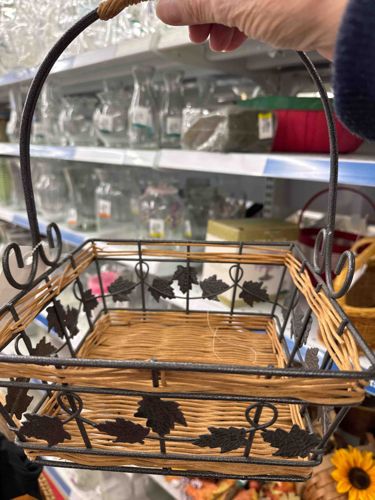 Mixed-Media Wrought Iron and Wicker Basket with Leaf Motifs