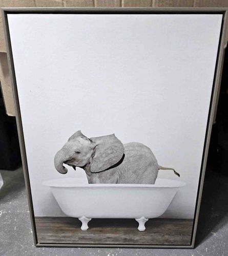 This contemporary piece of wall decor features a monochromatic digital composite photograph depicting a baby elephant seated inside a white clawfoot bathtub. The artwork is printed on a textured white canvas and is presented in a modern, slim 'floater' style frame with a light grey or champagne-toned metallic finish. The composition is minimalist, utilizing a vast negative white space above the subject to create a clean, modern aesthetic. The bottom portion of the print shows the bathtub resting on a rustic, dark wood plank floor, providing a grounding element to the whimsical scene. While the image is primarily grayscale, there are subtle warm tones in the floorboards. The framing craftsmanship appears consistent with contemporary retail home decor standards, likely produced within the last 5-10 years. No visible signatures or maker's marks are present on the front of the piece. The overall condition appears excellent with no visible scuffs to the frame or sagging in the canvas tension, though some slight discoloration is noted on the bottom left corner of the frame itself.