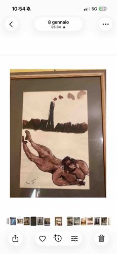 This artwork is an original modernist painting executed in watercolor and dark ink on paper. The composition features a prominent, volumetric nude female figure reclining in the bottom half of the frame. Her form is rendered with thick, expressive line work and earthy tonal washes, emphasizing a sculptural quality. In the background, a silhouette of an industrial landscape is visible, including a smokestack emitting puffs of smoke, rendered in a deep sepia or black pigment. The juxtaposition of the soft, organic human form against the rigid, industrial background suggests a mid-20th-century stylistic influence, possibly reflecting Italian Neorealism or Expressionism. The piece is signed in the lower-left corner with a stylized signature that appears to read 'Maccari' or similar, which may point to Mino Maccari, an artist known for such expressive charcoal and watercolor figures. The artwork is housed in a simple rectangular frame with a wide, neutral-toned mat board that complements the earthy colors of the painting. Condition-wise, the paper appears slightly aged with a subtle patina, though no major tears or water damage are visible from the image. The framing appears contemporary and well-maintained, providing archival support to the medium. The craftsmanship is high, showing deliberate brushwork and a confident use of negative space to balance the heavy industrial shapes with the reclining figure.