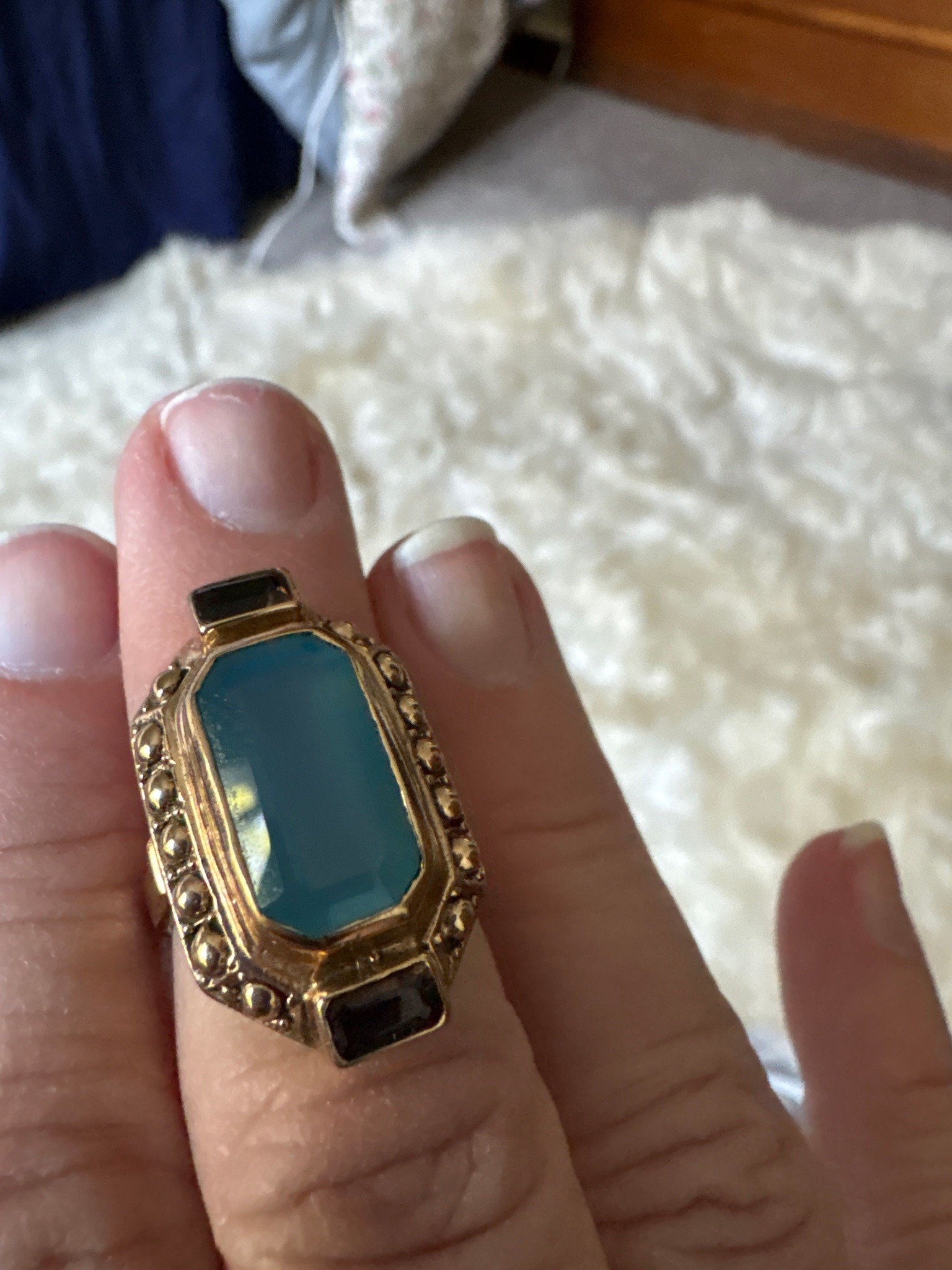 This is an ornate, statement-style ring featuring a large, vertically set emerald-cut semi-precious stone, likely blue chalcedony or blue agate, characterized by its soft, translucent teal or cerulean hue. The central stone is held in a rub-over bezel setting. The primary stone is flanked at the top and bottom by two smaller, rectangular emerald-cut stones that appear to be dark garnets or possibly black onyx, adding a sharp color contrast. The mounting is constructed from a yellow metal, likely 10k or 14k gold, or high-quality gold plating over sterling silver, consistent with Victorian-Revival styles from the mid-20th century (circa 1950s–1970s). The perimeter of the central bezel is embellished with a decorative 'granulation' or beaded texture, contributing to an antique aesthetic. The overall construction appears solid, with a wide, substantial shank visible behind the finger. Condition-wise, the ring shows signs of light wear and tarnish consistent with age, particularly in the recessed areas of the beadwork, which adds an attractive patina. There are no immediate signs of significant chipping to the stones, though micro-scratches are visible on the flat facets of the blue stone under close inspection. The craftsmanship suggests a commercial production designed to emulate high-end Victorian mourning or cocktail jewelry.