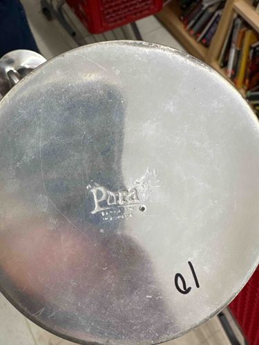 This is a contemporary metal candlestick holder produced by Pura, a manufacturer based in Bali, Indonesia. The item is crafted from pewter, evidenced by its characteristic soft, matte silvery-grey finish and the maker's stamp on the underside of the base. The base is circular and flat, featuring a stamped 'Pura' logo with additional text below it indicating 'MADE IN INDONESIA'. The metal shows signs of moderate wear, including fine surface scratches, minor scuffing, and small dings consistent with handling and use. There is a visible black ink marking 'e1' written manually on the bottom, likely a previous stock or inventory code. The construction is solid and cast, typical of mid-to-high quality decorative pewter ware from the late 20th to early 21st century. The patina is slightly dull with some oxidation, which is common for this alloy. The overall craftsmanship reflects a blend of traditional metalworking techniques and modern manufacturing standards from the Southeast Asian region.