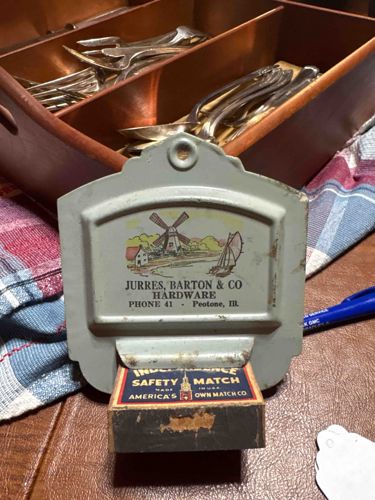 This is a vintage wall-mounted tin matchbox holder used as a promotional advertising piece for 'Jurres, Barton & Co. Hardware,' located in Peotone, Illinois. The item is constructed from pressed tin with a light grey or sage enamel finish. The top features a decorative scalloped crest with a pre-drilled mounting hole. The central graphic depicts a pastoral scene of a windmill, a cottage, and a sailboat, rendered in a late 19th to early 20th-century lithographic style. Text below the image includes the company name and a two-digit telephone number ('Phone 41'), suggesting a date of manufacture from the early 1900s to the 1930s. The bottom of the holder is shaped to grip a standard safety matchbox; a box of 'Independence Safety Matches' is currently inside. Condition-wise, the piece shows authentic age-related wear, including minor paint loss, surface scratches, and small spots of oxidation/rust particularly around the edges and the matchbox holder lip. The lithographic transfer remains largely intact and legible, though slightly faded. The craftsmanship is typical of high-volume advertising premiums from the era, utilizing durable stamped metal intended for utilitarian kitchen or workshop use.