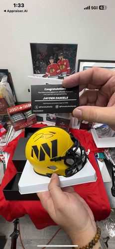 This item is a collectible Riddell speed-style mini football helmet, specifically a commemorative edition for the LSU Tigers featuring a vibrant matte yellow finish. The helmet is adorned with a stylized black 'M' graphic on the side and includes a black facemask, interior padding replicas, and a chin strap. A critical highlight is the hand-signed autograph by Jayden Daniels located on the top left crown area, executed in a bold black felt-tip marker. The autograph appears fluent and clear, consistent with official signing sessions. The item is accompanied by a Fanatics Authentic certification card, which serves as a provenance document with the serial number 'PA03444033'. This piece of sports memorabilia captures the 2023 Heisman Trophy winner's collegiate legacy. The condition appears to be mint or near-mint, showing no visible scuffs, paint chips, or fading. It sits within its original white plastic display base, designed for shelf presentation. The craftsmanship of the mini helmet reflects high-quality licensed production standards, mimicking the geometry of a full-sized competition helmet.
