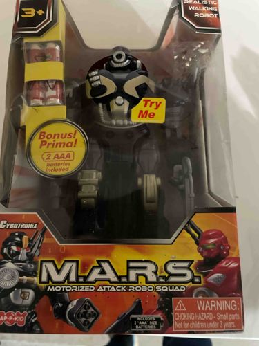 This is a mass-produced electronic action figure toy manufactured by Hap-p-Kid under the Cybotronix brand name. The item is a motorized walking robot from the M.A.R.S. (Motorized Attack Robo Squad) line. It is constructed primarily of molded bipedal plastic with a color scheme consisting of black, silver, and gold accents. The robot features a humanoid design with mechanical detailing, including a circular 'eye' sensor at the top and articulating arms. A key feature is its battery-operated walking mechanism, marketed as a 'Realistic Walking Robot.' The figure is housed in its original retail window-box packaging, which includes a 'Try Me' function button visible through the plastic. The packaging also boasts a 'Bonus' of 2 AAA batteries already included. While the toy is modern (likely from the 2000s or 2010s), the packaging shows some minor shelf wear, particularly on the edges and the plastic window. The '3+' age rating and safety warnings are clearly displayed in the bottom right corner. This specific model is identified by its black and gold color variant, distinguishing it from other robots in the squad, such as the red member shown in the package artwork.